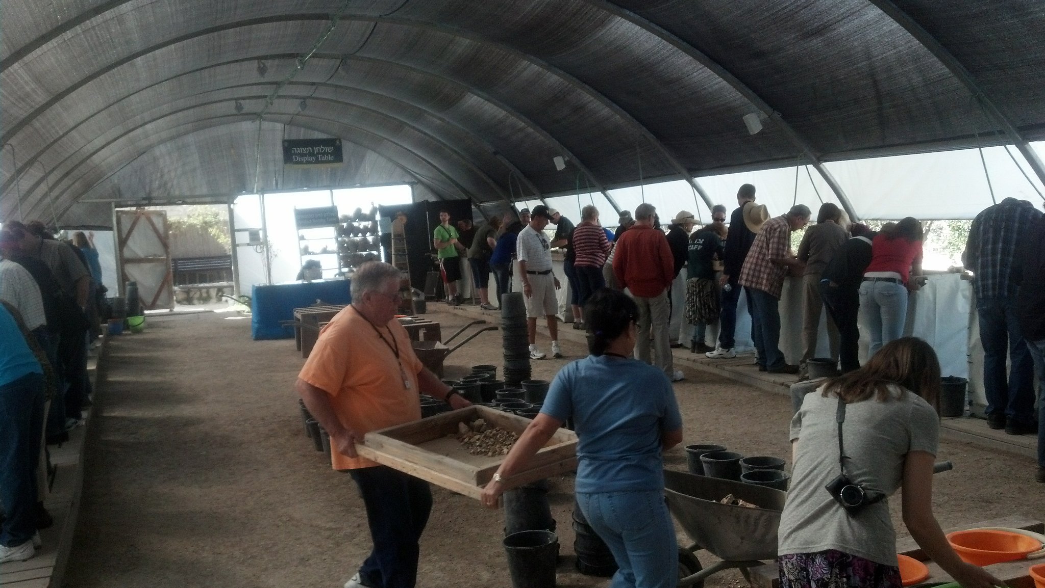 Determined to salvage as much as possible, donations were made to begin salvage operations of that debris. Today, visitors are invited to work alongside archeologists sifting through debris in search of coins, mosaic pieces, pottery, bones of sacrificial animals, Roman glass and other things. Here is our group at work on this project…