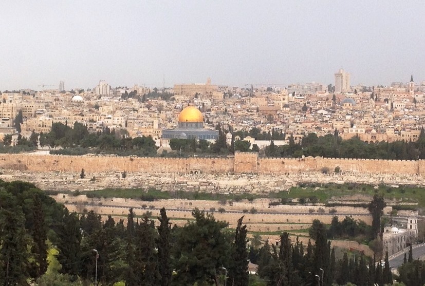 We’ll focus on Olivet, and will refer to it as the Mount of Olives, as that is how it is typically translated in our Bibles.  It is rich in history!  David went there weeping, to escape his son Absalom (2 Samuel 15:30-37); Ezekiel looked on as the glory of the Lord left Solomon’s temple to hover over the mount (Ezekiel 11:22-23); in a vision, Ezekiel witnessed the prophetic event of the glory of the Lord returning from the east (over the Mount of Olives) to a new temple (Ezekiel 43:1-5); and Zechariah prophesies that,  at His return, the Lord’s feet will one day stand on the Mount of Olives and the mountain will split in two (Zechariah 14:3-5)!  Here’s the view Jesus would have today if He stepped foot on the Mount of Olives.