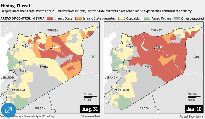 The Wall Street Journal article and territory map of ISIS referenced below caught my attention because of the very overwhelming territory gain by ISIS in Syria, and the lack of ability to stop them. Why do I find this significant? Read Isaiah 17:1 and Jeremiah 49:23-27. The prophets tell us a day is coming when Damascus will cease to exist…it will be utterly destroyed. There are many who believe that event could be the falling domino that cascades into the Northern Invasion, prophesied in Ezekiel 38-39. Meanwhile, ISIS is swallowing up Syria, a land of plentiful WMD’s (weapons of mass destruction), and encroachment on Damascus could set any number of WMD scenarios in motion.