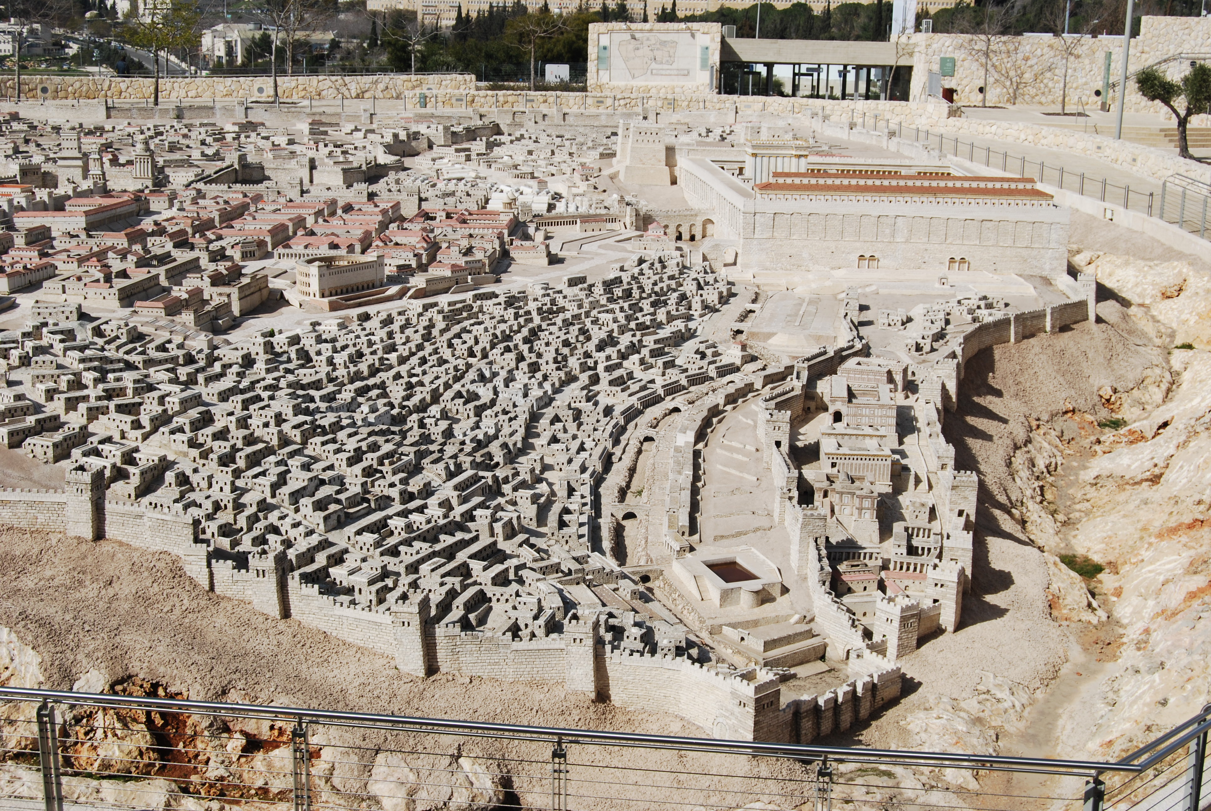 model city of Jerusalem at the time of Jesus. In the lower right corner, you will see the convergence of two valleys. The Pool of Siloam lies in that area, and the City of David stretches from that lower right corner northward to Temple Mount, the prominent structure in the upper right part of the picture.