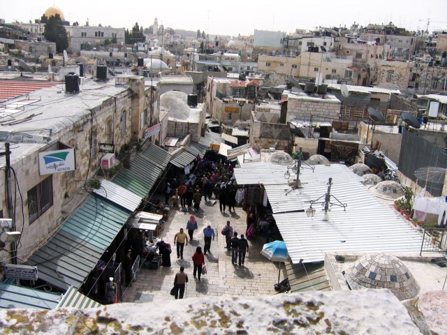 Four “quarters” (not the same size) lie within the walls of the Old City: Jewish Quarter, Christian Quarter, Armenian Quarter and the Muslim Quarter. Each has its unique character. Here is a picture of the marketplace in an Arab section of the Old City, just inside Damascus Gate:
