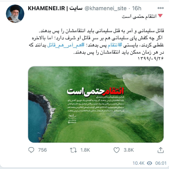 Earlier this morning, the Supreme Leader Ayatollah Khamenei of Iran issued a very clear death threat upon the life of former President Donald Trump. On his Twitter page, in Farsi (the language of Iranians), he stated his intent to exercise revenge for the killing of terrorist mastermind, Qassem Soleimani.