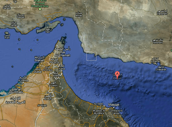 News is emerging from the Sea of Oman, near the Strait of Hormuz, of several sea vessels being disabled and one hijacked by at least 8-9 armed militiamen, thought to be proxies of Iran. Here is a map of the area, as well as the location of the hijacked ship: