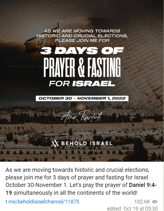 Because of the deep need for leadership in Israel, Amir Tsarfati has invited believers worldwide to join him for 3 days of prayer and fasting prior to Israel’s elections. Will you join the effort by committing to pray and fast for Israel October 30 – November 1?