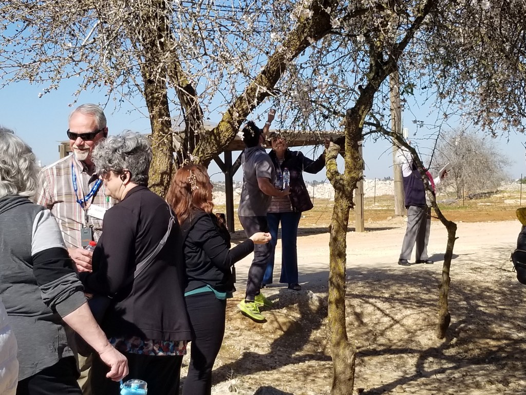 Our guide, Aly, teaching about the priestly breastplate, our group picking almonds (the trees are beautiful in bloom!), city of Nablus (Biblical Shechem)