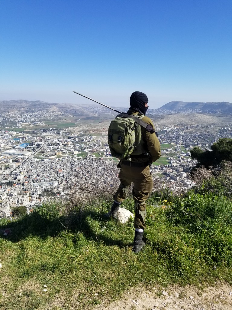We then ascended Mt Gerizim, stopping at a lookout over ancient Shechem (modern-day Nablus). Nablus is known to be a hotbed for Palestinian terrorists and from our vantage point high above, we could see the reality the Palestinian Authority does not want people to know. The Palestinian “refugee camps” which keep the Arab world supporting the “rights” of the Palestinians, are not refugee camps at all, but fairly modern housing with UN presence right there. Joining us from the overlook was a lone Israeli soldier patroling the area from that vantage point. We cannot show his face on social media, but below you will see a picture of him on duty, with eyes wide open, ready to identify trouble.