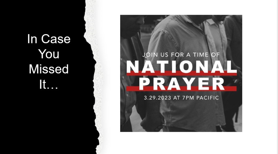 If you were unable to join the National Call to Prayer live, it is not too late. Please take time to join it now. Virtually every segment of society is included in this prayer effort, and it will inspire you to pray as well. Believers, it is time to put aside things that have no eternal value and take up the mantle of prayer. Modern technology allows us to join this prayer effort at any time…and now is the time. (PS: YouTube restricted it because it contains actual footage of Nashville TN police confronting the school shooter. Just click “Watch on YouTube.” If that doesn’t work, go to Calvary Chapel Chino Hill’s sermon website and find the Wednesday night “National Prayer” program on 3/29/2023.)