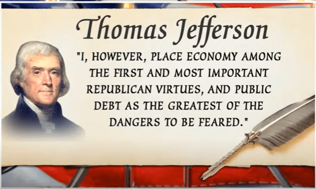 One concern of our founding fathers was government spending and fiscal responsibility. Yes, from the earliest of days men like Ben Franklin warned of the over-reliance on debt. Thomas Jefferson had this to say about it: