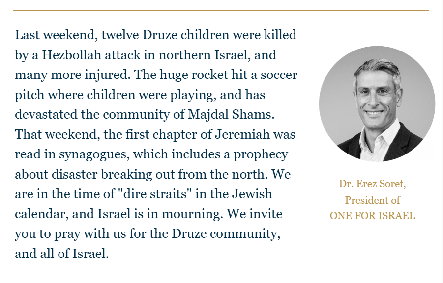 The Druze need our prayers, and it is also important to know how to pray for them and for Israel in general during these difficult days. One for Israel produces wonderful resources, including prayer guides. Why not take some time this weekend to learn how to pray effectively, then do so!