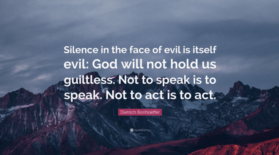 "Silence in the face of evil is itself evil: God will not hold us guiltless. Not to speak is to speak. Not to act is to act." - Pastor Dietrich Bonhoeffer