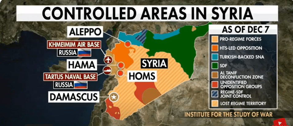 As seen on the “before” map in yesterday’s post, Syria was a collage of Assad loyalists, the Kurds and allied forces, rebels/various terrorist groups, and al-Qaeda/ISIS cells. Assad is now gone and terrorist groups control most of Syria. Here is a look at who controls what as of a couple days ago: