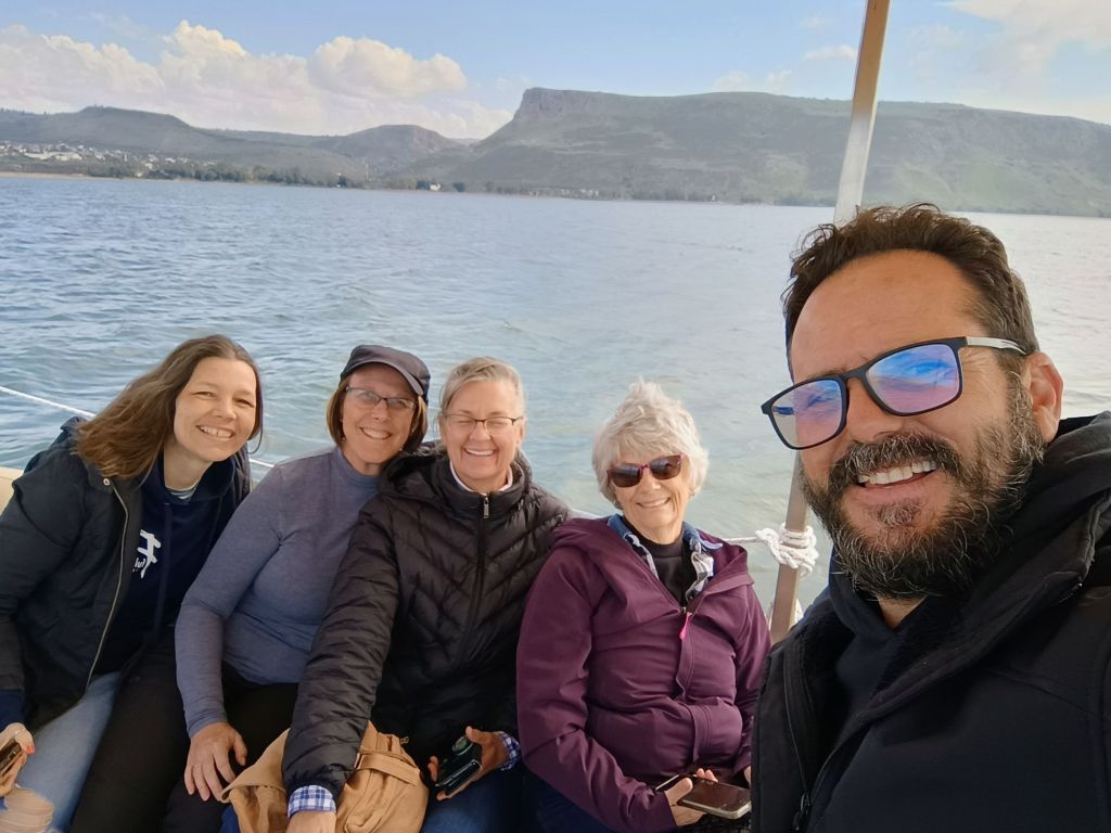 After the museum visit and a brief opportunity to shop in the souvenir store, the day’s first surprise was sprung! Up pulled a small boat I had arranged to take our guests out on the Sea upon which Jesus once walked! Thankfully, the storm had subsided just a short while earlier and it was a great experience with Captain David! (Look at those blue skies following the rain!)