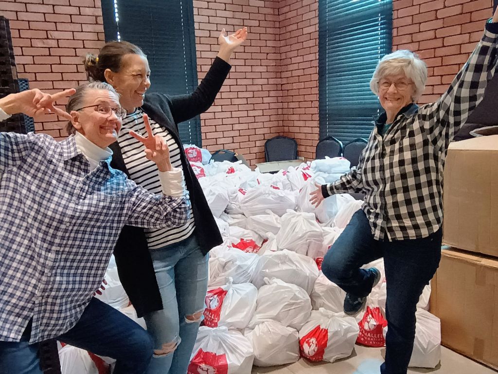 Food bags were filled with an abundance of very good food, including basic sugar, flour, etc, but also lasagna noodles, pickles, salmon, cookies and other goodies. They take good care of those in need. The 4 of us cleared off 4 pallets of food, totaling approximately 250 food bags.
