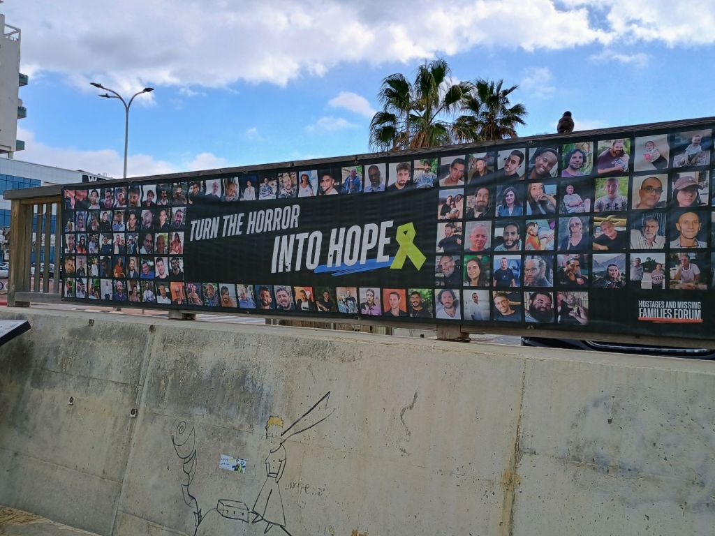 Along the Israeli Mediterranean coast, the further south you go, the more beautiful the beaches. With mid-winter-like weather and sea warnings, Mei Ami Beach was all but deserted. However, my mind’s eye can certainly imagine how beautiful and how lively this beach is in warmer weather. Along the path to the beach was a very common site: large banners filled with hostages’ pictures and evidence of the never-ending hopefulness of the Jewish people.