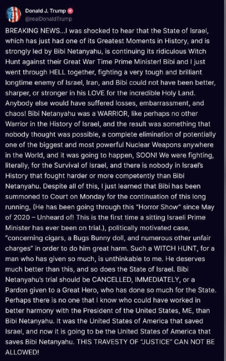 On Wednesday night, President Trump added another blessing to PM Benjamin Netanyahu when he put this out on Truth Social: