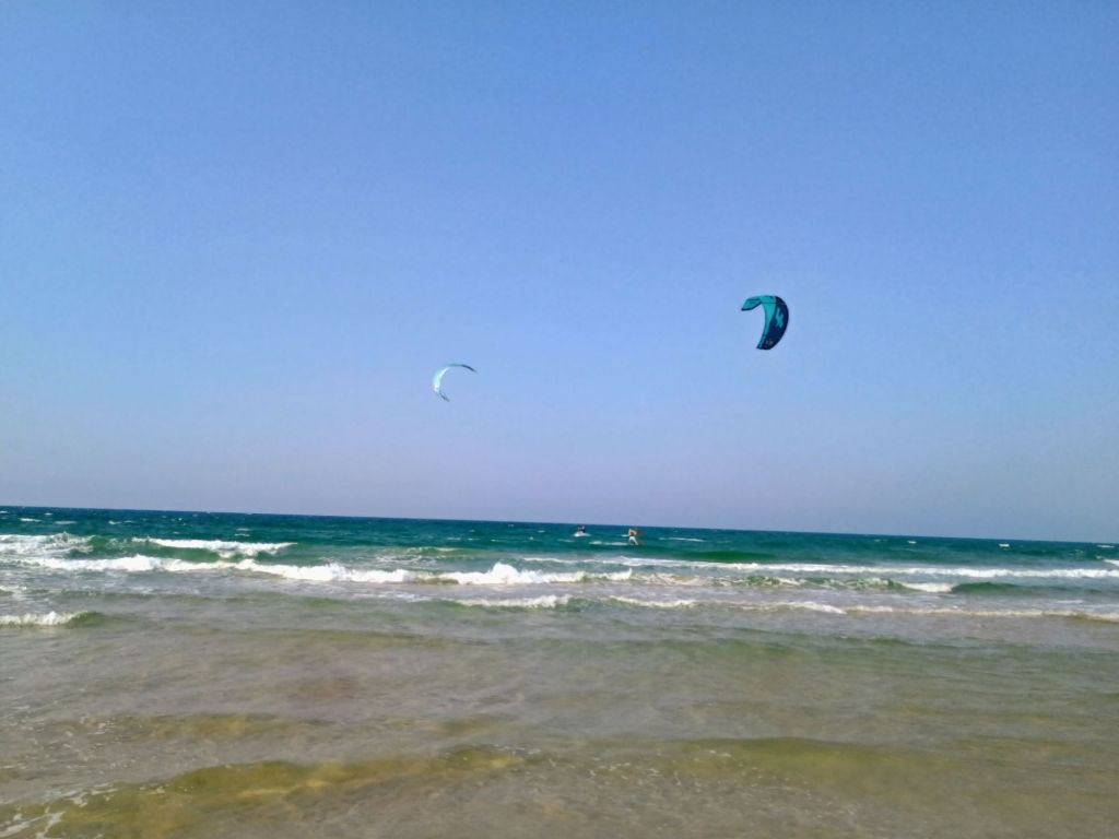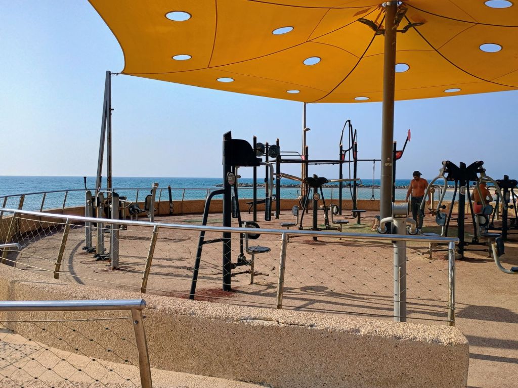 Those who arrived before us were scattered, enjoying a gorgeous 85-degree day on the beaches and streets of Netanya. So, I took a walk on the beach! It is so refreshing to see families out enjoying sun, sand and wind surfing (an Israeli “thing!”) The beach was filled with healthy-looking, sun-tanned bodies, lots of families with children, couples walking hand-in-hand, and no alcohol to be seen! Compared to America, there are very few overweight people, so it was just a pleasure seeing good, wholesome, fit people enjoying God’s beauty. (BTW – no membership fees at the gym below, and it’s totally fine to workout barefooted in the sand!)